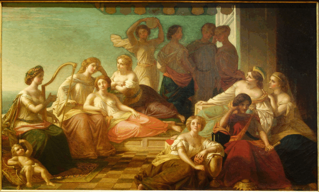 Thomas P. Rossiter, “Muses and Graces,” 1859, oil on canvas. Some of the Muses hold objects associated with their arts, such as a mask for drama and a drum for dance. (New Britain Museum of American Art. Photo credit: Wikimedia Commons.)