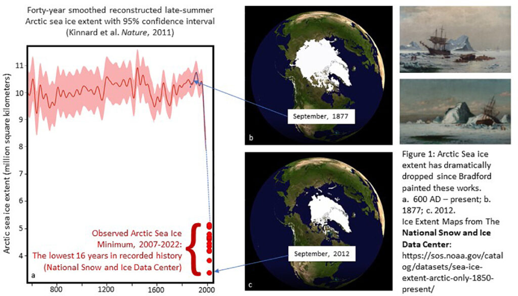Viewed in the context of climate change, Bradford’s paintings depicting the frozen polar regions from one hundred fifty years ago conjure up feelings of anxiety and reminiscence in a geoscientist. Anxiety, because such Arctic scenes have already become far less pervasive than they were in Bradford’s time and point to a troubling climate future that is upon us. Reminiscence, because those icy scenes may someday be gone forever, preserved now only in memories, illustrations, and paintings like this and his Among the Ice Floes nearby. Every September, Arctic sea ice melts and reaches its annual minimum extent. Warming climates have reduced the areal coverage and thickness of Arctic sea ice by about 60 percent since 1878 when Bradford painted these (see figures 1a, 1b), and all of that reduction has occurred since c. 1970. At its present rate of decline, summer Arctic sea ice will be completely gone sometime in the latter half of this century. While the opening of shipping lanes in the Arctic might seem attractive to mariners like the souls pictured in Bradford’s works (like the fabled Northwest Passage that opened for the first time in 2012, see figure 1c), the accompanying consequences of global warming will far outweigh this apparent benefit. Ice, a majestic blue-tinted rock in its own right, is slowly fading from the surface of planet Earth for the first time in human history. Bradford’s painting captures its story.