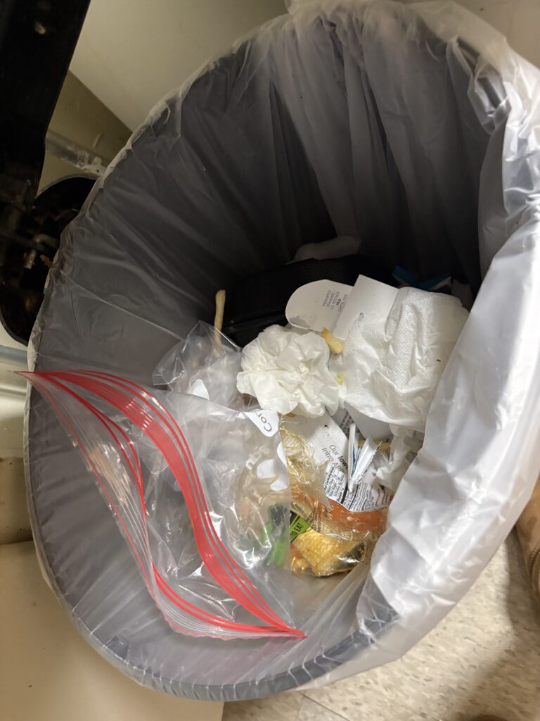In this week’s picture, it is not as full as I normally see it. I do see lots of paper and tissue and other plastic items. I also see food remnants and other things that relate to the kitchen. It is important to highlight that this weekend, my family is still sick, and I also have been feeling under the weather, so more tissues have been used this week.